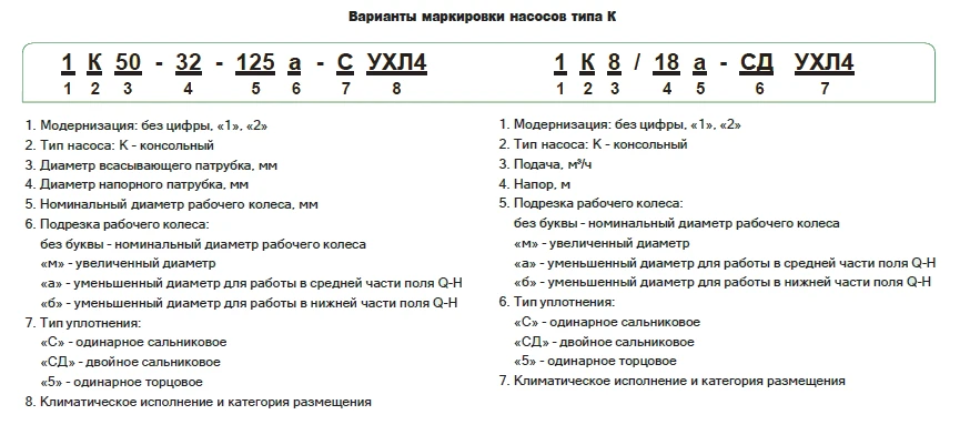 В типовой комплектации насосы поставляются с одинарным сальником, в климатическом исполнении УХЛ4. Под заказ насос может быть изготовлен с двойным сальниковым или одинарным торцовым уплотнением, а также в климатических исполнениях Т, ТВ, ТС.